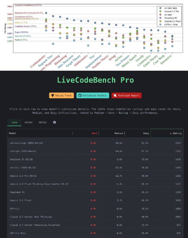 This test is called LiveCodeBench Pro. It includes the most advanced and difficult problems from platforms like Codeforces, as well as from ICPC and IOI olympiads. All tasks were prepared by winners and medalists of these prestigious competitions, so the difficulty level is truly very high.