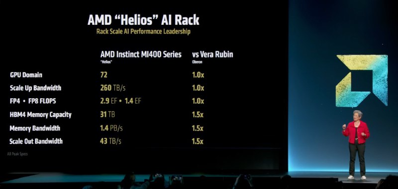 ➖ Another ambitious project is Helios AI-Rack, which directly competes with Nvidia NVL144 Vera Rubin. It comprises 72 MI400x cards, collectively delivering approximately 2.9 exaflops in FP4. The system features a bandwidth of 1.4 petabytes per second and 31 TB of video memory, with an interconnect level comparable to NVLink. Its release is scheduled for 2026.
