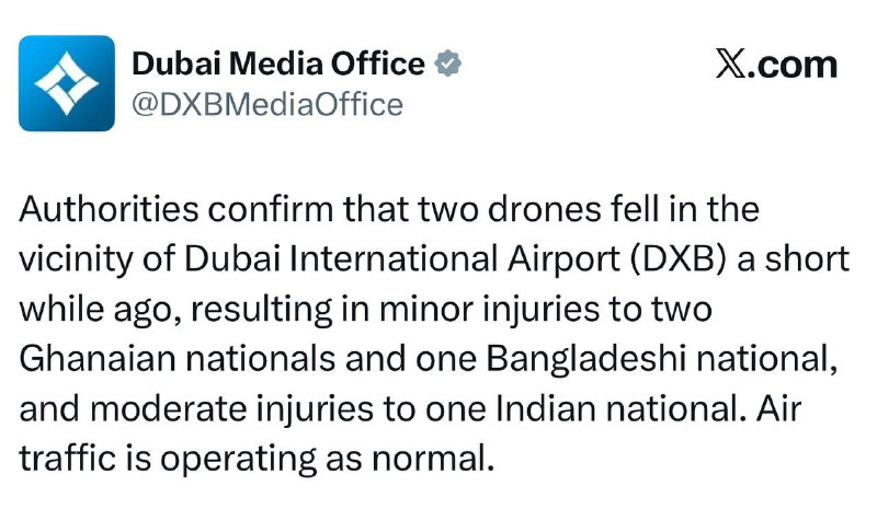 Breaking news — several drones crashed near Dubai Airport, resulting in four people injured.