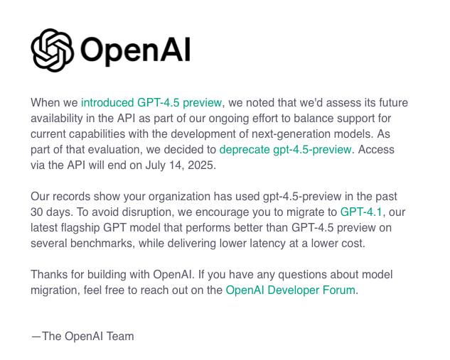 On July 13th, access to GPT-4.5 via API will be closed. OpenAI explains this by stating that the focus now needs to be on developing new models, and support for GPT-4.5 appears to be consuming too many resources.