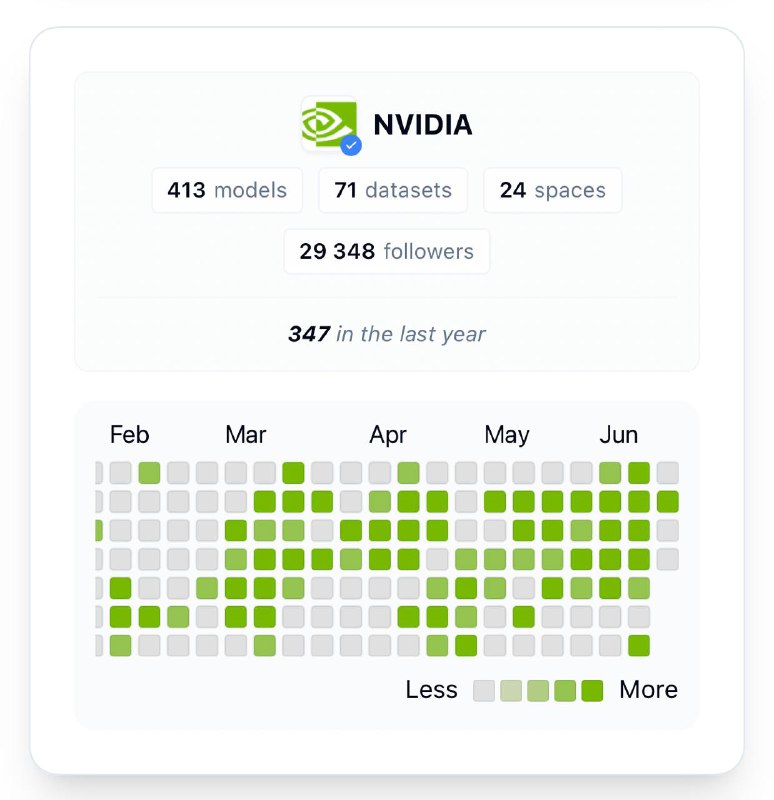 Nvidia has set a new record for the number of open projects in the field of artificial intelligence among large companies. The screenshot shows their activity on the Hugging Face platform since early 2025 — in just one year, they released 347 new releases. This allowed them to surpass giants like Meta, Microsoft, Google, Mistral, DeepSeek, and even the Hugging Face team itself.