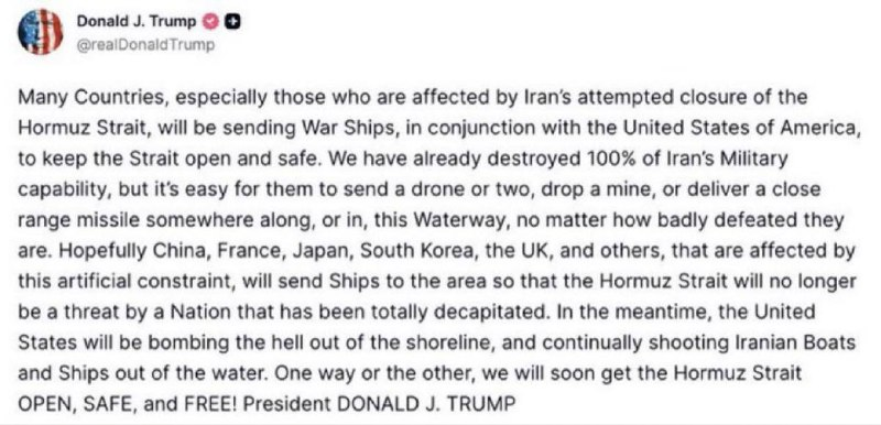 Breaking news: Donald Trump announced that the United States and several other countries will send naval ships to the region to ensure free and safe passage through the Hormuz Strait.